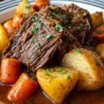 This 5-Star Pot Roast Slow Cooker recipe offers a tender and flavorful chuck roast cooked to perfection with aromatic herbs, vegetables, and a rich beef broth. Utilizing a slow cooker for effortless, melt-in-your-mouth results, this classic comfort meal is ideal for family dinners or hearty gatherings.