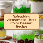 Che Ba Mau, or Vietnamese Three Color Dessert, is a refreshing and vibrant sweet treat perfect for warm days. It combines layers of colorful jellies, beans, and creamy coconut sauce for a delightful mix of textures and flavors.