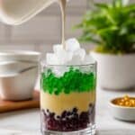 7. Step 7: Assemble the dessert. In serving cups, layer mung bean puree, red beans, and pandan jelly. Top with cooled coconut sauce and crushed ice. Mix gently before enjoying.