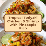 - Assemble and Serve: Plate 1.5 cups of cooked rice, top with one grilled chicken breast, and spoon 2 to 3 tablespoons of the heated teriyaki sauce over the chicken. Add the pineapple pico de gallo on top and place the grilled shrimp over everything. Finish with a squeeze of fresh lime and a sprinkle of cilantro for freshness and brightness.