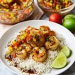 Store any leftover chicken, shrimp, and salsa separately in airtight containers in the refrigerator for up to 3 days. Reheat chicken and shrimp gently in a skillet over low heat or in the microwave until warmed through. The rice can be reheated with a splash of water to keep it moist.