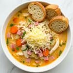 This comforting Chicken Cordon Bleu Soup recipe combines tender chicken, savory ham, and creamy cheese in a rich, flavorful broth. Inspired by the classic chicken cordon bleu dish, this hearty soup features a blend of vegetables, Dijon mustard, cream cheese, and Swiss cheese, making it the perfect cozy meal for cooler days. Served with crispy croutons and melted Swiss cheese on top, it’s a delicious twist on a beloved classic.