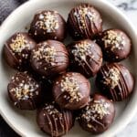 - Coat the Balls: Dip each chilled ball into the melted chocolate, ensuring it is fully covered, then allow excess chocolate to drip off before placing them back onto the parchment-lined sheet. Optionally, sprinkle flaky sea salt on top for enhanced flavor.