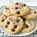 A stack of soft, round cookies with a light golden color sits piled on a white plate with a black cooling rack underneath. Each cookie is studded with dark brown chocolate chips, large white chocolate chips, and colorful red, green, and white sprinkles. crushed peppermint candy pieces are scattered on top, adding a mix of white and red fragments. The texture of the cookies appears soft and slightly crumbly with visible cracks on the surface. The background is a white marbled texture that contrasts with the colorful cookies. photo taken with an iphone --ar 4:5 --v 7