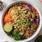 - Combine Salad: In a large bowl, add shredded red cabbage, sliced red bell pepper, shredded carrots, sliced green onions, thawed edamame, and cooled ramen noodles. Pour the prepared peanut dressing over the salad and toss everything gently but thoroughly to coat all ingredients evenly.