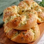 Delightfully savory Cream Cheese Stuffed Bagels infused with garlic, herbs, and a buttery topping, baked to golden perfection. This recipe offers a delicious twist on plain bagels by filling them with a flavorful herbed cream cheese mixture and finishing with a fragrant garlic butter glaze and crunchy sesame seeds.