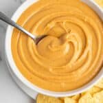 A creamy, thick orange-yellow dip fills a round white bowl with a smooth surface showing slight texture from blended ingredients; a silver spoon is scooping the dip in the center, creating gentle swirls around it. The bowl sits partially on a white marbled surface with pieces of light yellow tortilla chips surrounding it at the bottom right edge. The overall look is warm and inviting, showing a rich and velvety texture of the dip. photo taken with an iphone --ar 4:5 --v 7