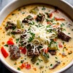 Keywords: Philly Cheese Steak Soup, creamy beef soup, comfort food, easy soup recipe, cheesy soup