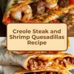 This Creole Steak and Shrimp Quesadillas recipe combines tender marinated ribeye steak and succulent shrimp with vibrant sautéed bell peppers and onions, all seasoned with a flavorful Creole rub and sauce. Griddled in a large skillet and layered with melted Mexican cheese inside warm 14-inch tortillas, these quesadillas offer a delicious fusion of Cajun-inspired spices and classic Tex-Mex comfort food. Perfect for a hearty lunch or dinner, they’re served with extra Creole sauce for dipping.