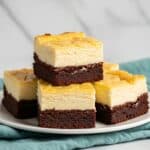 A stack of square dessert bars with two visible layers placed on a white plate; the bottom layer is dark brown, dense, and fudgy with a rich chocolate texture, while the top layer is creamy and pale yellow, smooth with slight cracks, resembling cheesecake. The layers blend slightly where they meet, and the top has a crinkled, cracked surface with a glossy finish. The plate sits on a soft teal cloth, and the background is a white marbled texture. Photo taken with an iphone --ar 4:5 --v 7