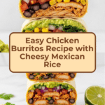 This Easy Chicken Burritos recipe combines juicy, spiced chicken with refried beans, Mexican rice, corn, and melted cheddar cheese wrapped in warm flour tortillas. Toasted to perfection for a crispy finish, these burritos are a flavorful and satisfying meal perfect for a quick dinner or casual gathering. Serve with salsa, sour cream, or nacho cheese sauce for added indulgence.