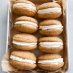 Store assembled whoopie pies in an airtight container in the refrigerator for up to 5 days. Allow them to come to room temperature for about 15 minutes before serving for the best texture. You can freeze the cookies and frosting separately for up to 2 months and assemble when ready to enjoy.