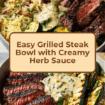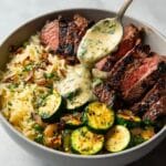 This Grilled Steak Bowl with Creamy Sauce & Grilled Zucchini is a hearty and flavorful meal combining juicy, perfectly grilled steak with tender, charred zucchini slices. Served over a bed of cooked rice or creamy mashed potatoes, and topped with a zesty herb-infused creamy sauce, this bowl offers a comforting balance of textures and tastes perfect for lunch or dinner.