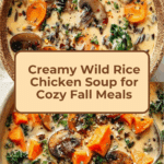This hearty fall wild rice and chicken soup combines tender wild rice, savory vegetables, mushrooms, and shredded chicken in a creamy broth with aromatic herbs and a hint of white wine. Perfect for cozy autumn evenings, this nourishing soup is finished with fresh parsley, toasted nuts, and optional Parmesan cheese for added flavor and texture.
