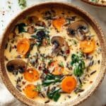 This hearty fall wild rice and chicken soup combines tender wild rice, savory vegetables, mushrooms, and shredded chicken in a creamy broth with aromatic herbs and a hint of white wine. Perfect for cozy autumn evenings, this nourishing soup is finished with fresh parsley, toasted nuts, and optional Parmesan cheese for added flavor and texture.