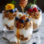 - Assemble the Parfaits: Layer Ingredients: In serving glasses or bowls, layer the yogurt mixture, granola, and a drizzle of honey. Repeat these layers until the glasses are filled, finishing with a final layer of yogurt on top.