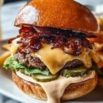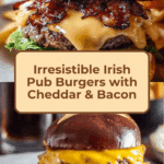 These Irish Pub Burgers combine juicy, flavorful beef patties with crispy bacon, rich caramelized onions cooked in Irish stout, and a tangy sour cream and Dijon mustard sauce, all sandwiched in buttery toasted brioche buns for a hearty pub-style meal.