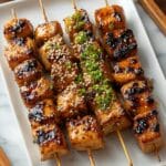 - Serve: Remove the cooked skewers from the heat. Garnish with sesame seeds, chopped scallions, or a sprinkle of shichimi togarashi if desired. Serve hot alongside extra tare sauce for dipping.