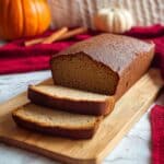 A rectangular loaf of brown bread rests on a wooden cutting board placed on a white marbled surface, with three thick slices cut and slightly fanned out in front. The bread has a deep brown crust with a soft, light brown interior that looks dense and moist. In the background, a small pumpkin and cinnamon sticks add a warm, autumn feel along with a red cloth and a white textured napkin. photo taken with an iphone --ar 4:5 --v 7