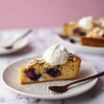 A slice of light golden cake with visible dark berries baked inside is placed on a white plate with horizontal ridges, topped with a smooth white cream dollop on one side and sprinkled with sliced almonds on top. Beside the cake, a dark wooden spoon rests on the plate. In the background, there is a blurred second white plate with a similar cake slice and cream with another dark wooden spoon. The setting is on a white marbled surface with a soft pink backdrop. photo taken with an iphone --ar 4:5 --v 7