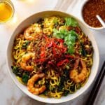 Nonya Hokkien Stir-Fried Noodles is a flavorful and authentic Malaysian dish featuring fresh lo mein noodles stir-fried with pork belly, shrimp, and vibrant vegetables, finished with a fragrant fermented soybean paste sauce and topped with crispy shallots, egg strips, fresh chiles, and cilantro. This quick and savory stir-fry offers a perfect balance of textures and umami-rich flavors, best enjoyed with a spicy sambal belacan on the side.