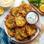 A white plate on a white marbled surface holds about ten golden-brown onion fritters with crispy edges and some green herbs sprinkled on top, arranged in layers overlapping each other. Next to the fritters in the same plate is a small brown bowl filled with white thick yogurt sauce mixed with green herbs, with a spoon standing in it. Nearby on the white marbled surface, there is a white bowl with a yellow and blue dotted pattern, filled with a pale-yellow powdery substance and a silver spoon resting inside. In the top right corner, a wooden board holds fresh green cilantro and a lemon wedge. A piece of beige burlap fabric is partially under the plate, and a dark blue cloth with white patterns is spread at the bottom left corner. photo taken with an iphone --ar 4:5 --v 7
