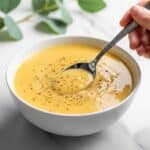 The image shows a white bowl filled with creamy yellow soup, speckled with small bits of black pepper floating on top. A silver spoon, held by a woman's hand, dips into the smooth soup, catching the light and showing the soup's thick texture. The bowl sits on a white marbled surface with some green leaves softly blurred in the background. photo taken with an iphone --ar 4:5 --v 7