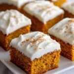Store leftover pumpkin pie spice squares covered in the refrigerator for up to 4 days. Reheat gently in the microwave or enjoy chilled. The yogurt topping is best added fresh before serving.