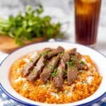 Queso Steak and Rice is a hearty, flavorful dish featuring toasty white rice cooked in a seasoned tomato broth, topped with tender skillet-seared sirloin steak and smothered in creamy Gordo’s queso cheese dip. This comforting one-pan meal combines smoky spices, savory tomato sauce, and melted cheese for a satisfying Tex-Mex inspired dinner that’s quick and easy to prepare.