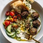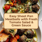 Keywords: sheet pan meatballs, green sauce, marinated tomato salad, baked meatballs, Mediterranean meatballs, easy weeknight dinner, ground beef meatballs, tzatziki, fresh herb sauce