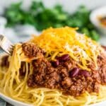 Once cooking is complete, serve the chili hot by itself or spooned over cooked spaghetti noodles. Top with shredded cheddar cheese, diced white onions, and warmed kidney beans according to preference.