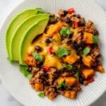 A hearty and flavorful Southwestern Ground Beef Sweet Potato Skillet featuring lean ground beef, sweet potatoes, black beans, and aromatic spices. This one-pan meal is easy to prepare on the stovetop, making it a perfect weeknight dinner that combines protein, fiber, and vibrant flavors with a melty cheese finish.
