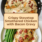Keywords: smothered chicken, stovetop chicken, bacon chicken recipe, southern chicken gravy, fried chicken breasts, homemade chicken gravy