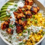 This Street Corn Chicken Rice Bowl is a vibrant and satisfying meal that combines tender chicken, smoky corn, and creamy avocado, all balanced with fresh lime and cilantro. Perfect for a quick weeknight dinner or meal prep, it brings bold flavors and comforting textures in every bite.