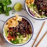 This Teriyaki Chicken Wonton Taco Bowls recipe is a vibrant and flavorful dish combining tender teriyaki-glazed chicken with a fresh, crunchy slaw and crispy air-fried wonton strips. Perfect for a quick yet satisfying meal, it blends Asian-inspired flavors with a fun taco bowl presentation, topped with sesame seeds, green onions, cilantro, and a zesty lime wedge for an extra burst of freshness.