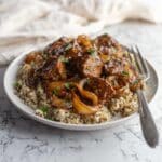 The dish shows a white plate with a base layer of cooked rice mixed with quinoa, giving a textured look with small grains in light brown and dark colors. On top, there are cooked onion slices that are caramelized to a golden-brown color, adding a soft yet slightly crisp layer. The top layer is made of chunky pieces of browned meat covered in a thick, glossy brown sauce. Small bits of green herbs are sprinkled over the dish, adding a fresh touch. A silver fork rests on the right side of the plate, and the setup sits on a white marbled surface with a soft, white cloth in the background. photo taken with an iphone --ar 4:5 --v 7